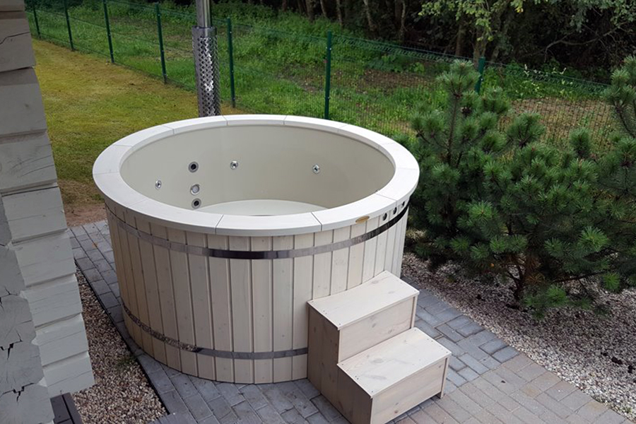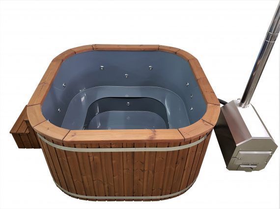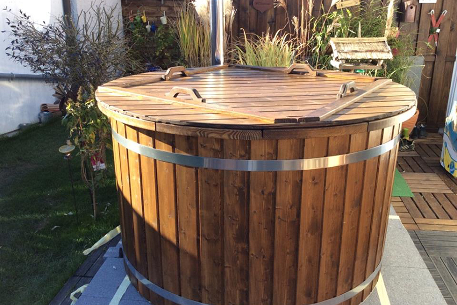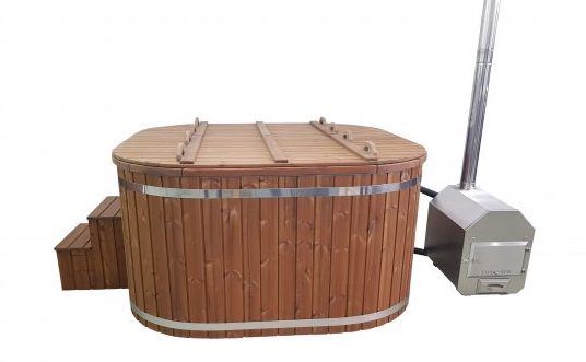 Bain nordique avec Poêle externe : Le poêle se trouve posé à l’extérieur du bain, libérant de l’espace dans le bain (environ +2 personnes). L’eau circule dans la double paroi du poêle par convection thermique sans qu’il soit utilisé de pompe électrique.