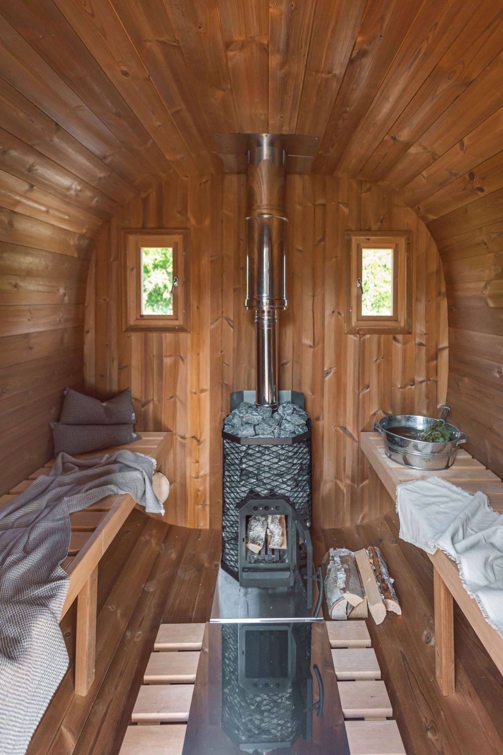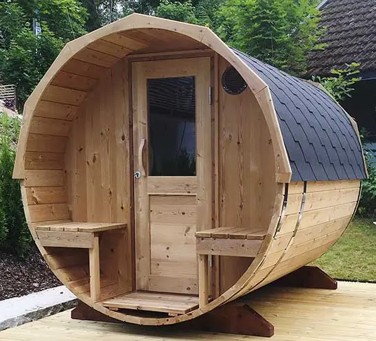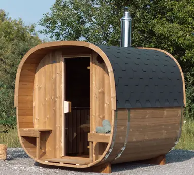 Sa forme cylindrique permet une montée en température rapide et une circulation de la chaleur. Ce type de sauna extérieur est apprécié pour son style authentique et nordique.