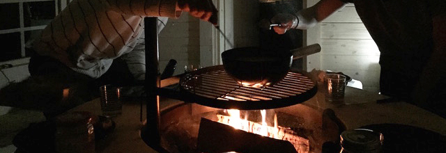 Le cœur de ce chalet scandinave en bois est son grill central avec hotte, conçu pour une utilisation en intérieur. Vous profitez d’un grill central avec hotte, d’un espace repas avec banc et table autour du foyer.